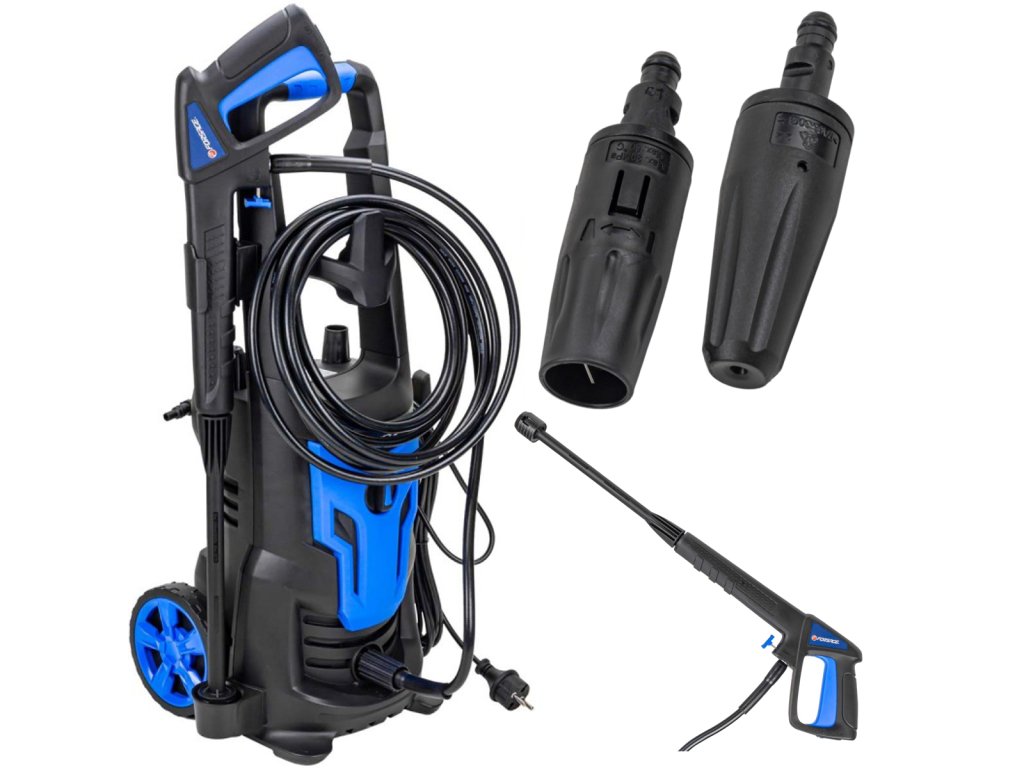 - Висока мощност: Благодарение на мощност от 1800 W и налягане от 135 bar, тази водоструйка FORSAGE може да се справи с различни видове замърсявания върху различни повърхности.