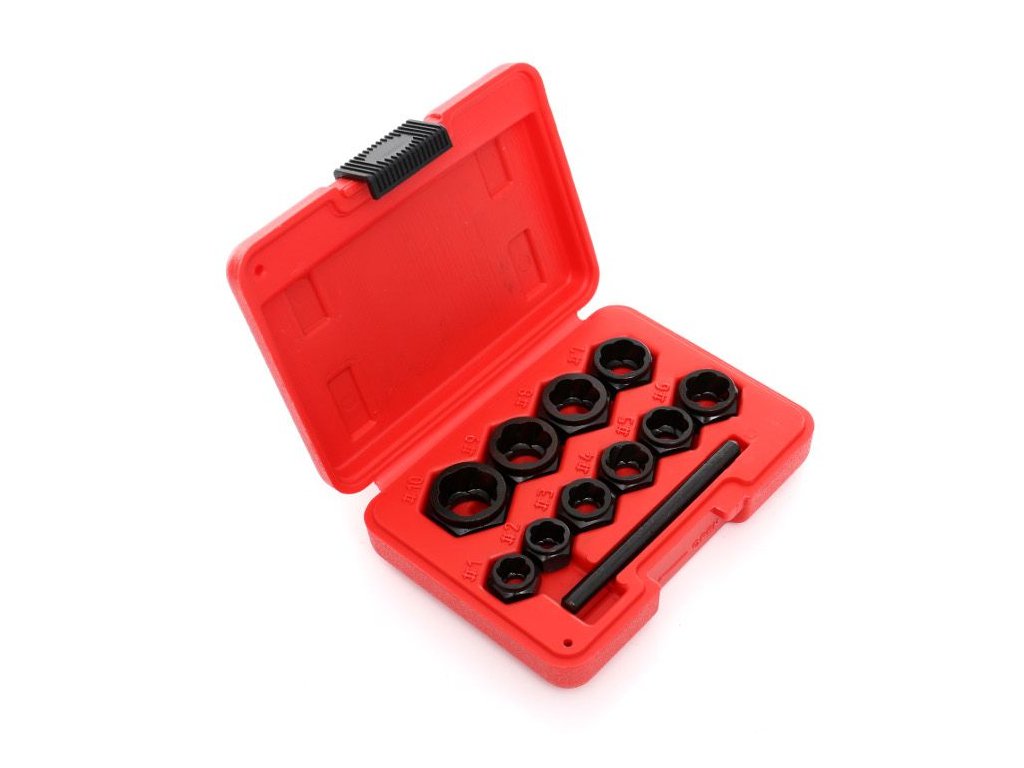 Комплектът съдържа екстрактори в 10 размера: 9, 10, 11, 12, 13, 14, 15, 16, 17 и 19 мм.