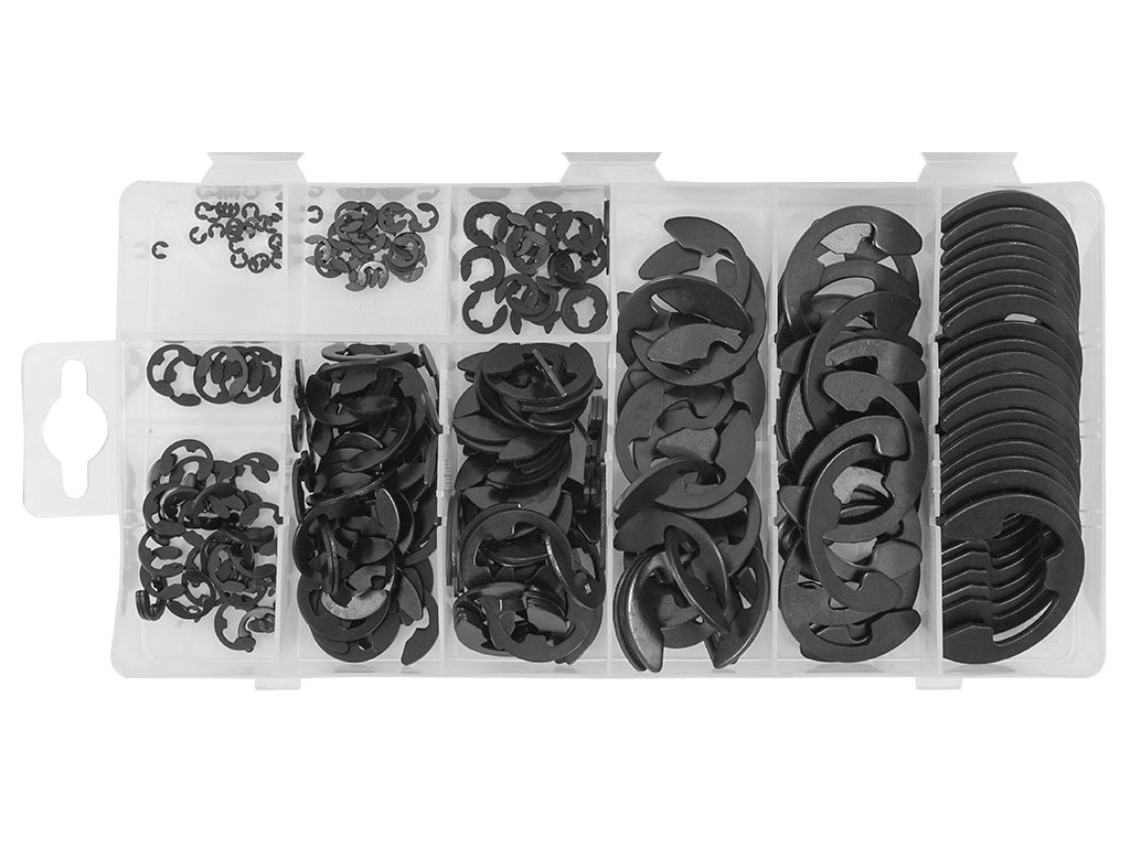 Задвижващи щифти тип Е 300 бр VERKE V06721 съдържа 300 бр. фиксиращи пръстени тип Е. Фиксиращите пръстени са опаковани в практична кутия с органайзер за лесно сортиране.