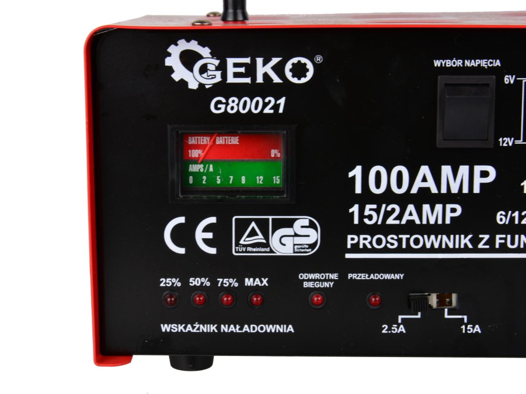 Зарядно устройство и стартиращ източник 100A 6/12V GEKO G80021 е перфектното решение за стартиране и зареждане на оловни акумулатори с напрежение 6V или 12V. Това устройство е широко използвано в леки автомобили, мотоциклети, лодки и други превозни средства, особено при пълно разреждане на акумулатора или при много ниски температури.