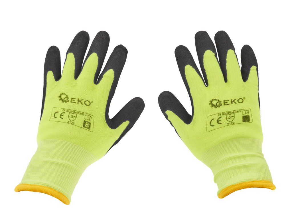 Работни ръкавици Geko са изработени от висококачествен полиестер, покрит с латекс, с вътрешен материал от акрилна прежда. Тези ръкавици осигуряват отлична защита от студ при работа на открито и на строителни обекти. Меката и топла подплата гарантира комфорт и топлина през дълги часове работа. Благодарение на светлоотразителните елементи, безопасността при работа се повишава, особено при слаба осветеност.